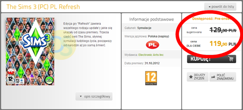 Podczas tłumaczenia dla Was pewnego artykułu, trafiłem na grę podobną do SimCity, poszedłem dalej i szukałem ofert w sklepach… No ale mniejsza. Szukając gry natrafiłem na sklep Muve, gdzie w ofercie dostępna jest gra podstawowa The Sims 3 oraz The Sims 3 Refresh. Pisałem już bardzo dawno temu czym jest Refresh. Dzisiaj można oficjalnie potwierdzić dostępność tego produktu w Polsce. Co ciekawe warto też zauważyć, że cena Refresh jest niższa niż normalnej gry podstawowej. TS3 Refresh dostępna jest w przedsprzedaży w cenie 119,90, a cena gry podstawowej to 129,90. Przypominam, że jeśli macie dostęp do Internetu i stale aktualizujecie swoją grę – Refresh nie jest Wam potrzebny. Oferta prawdopodobnie kierowana jest do nowych graczy, aby od samego początku mieli już funkcje, które pojawiały się w grze od 2009 roku.
