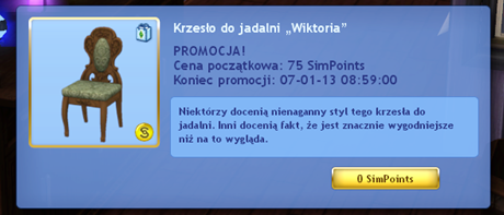 Włącz Tryb Store w swojej grze. Następnie poszukaj krzesła w kategorii „krzesła” no i łóżka w kategorii „łóżka”. Możesz też kliknąć specjalną gwiazdkę, która pojawi się nad panelem przedmiotów. Kliknij na niej, aby zobaczyć najciekawsze oferty. Pierwsze dwie, to będą właśnie krzesło i łóżko. 🙂
