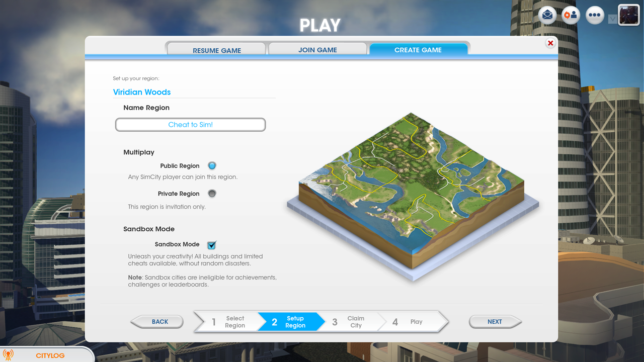 Region w trybie sandbox jest jak z艂agodzona wersja SimCity. W ka偶dym mie艣cie dysponujesz od pocz膮tku du偶ym zasobem simoleonów, a mo偶esz ich do艂o偶y膰 do kasy jeszcze wi臋cej jednym naci艣ni臋ciem klawisza. Symulacja funkcjonuje tak samo, jak w normalnym trybie, mo偶na jednak w dowolnej chwili wy艂膮czy膰 niektóre z systemów „utrudniaj膮cych 偶ycie”. Nie chcesz, 偶eby ogie艅 spustoszy艂 Twoje pi臋knie zaprojektowane przedmie艣cia? Wystarczy nacisn膮膰 Alt i F, a nie wybuchnie 偶aden po偶ar. Wola艂by艣, 偶eby trz臋sienia ziemi lub meteoryty nie obróci艂y w gruzowisko centrum Twojego miasta? Naci艣nij Alt i D, a omin膮 Ci臋 wszystkie katastrofy!