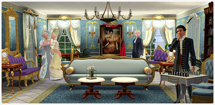 Pałac w Wersalu (1 975 1 625 SimPoints) – Pozwól swoim Simom odwiedzić przeszłość za pomocą tych mebli i strojów w stylu rokokowym! Obojętnie, czy budujesz pałac dla króla, czy chcesz tylko dodać coś do swojego salonu, te elementy wyposażenia z pewnością sprawią, że poczujesz się jak na królewskim dworze. Ubieraj się jak królowa, korzystając z najnowszych fryzur i mody sprzed dwustu lat! Ciesz się minionym pięknem dzisiaj – rokoko nigdy nie traci stylu!