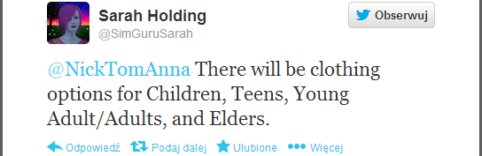 SimGuruSarah czyli Sarah Holding, producentka najnowszych filmowych akcesoriów dodała bardzo ciekawy wpis w serwisie Twitter. Otóż, jeden z fanów zapytał czy w akcesoriach będą dostępne ubrania dla dzieci. Producentka odpisała: W akcesoriach znajdą się ubrania dla dzieci, nastolatków, młodych dorosłych/dorosłych i dla emerytów. Co Wy na to? 🙂