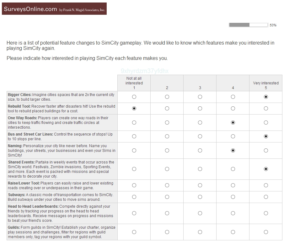 Serwis Polygamia opublikował artykuł dotyczący najnowszej sondy o SimCity, która została rozesłana do niektórych graczy. Sonda zawiera różne prawdopodobne nowości w SimCity, które jak wiemy z doświadczenia z The Sims 3, często się sprawdzają. Electronic Arts zapytało fanów o możliwych rozszerzeniach do SimCity, nowych DLC oraz o poprawki, które (zapewne) powinny pojawić się w jakiejś aktualizacji gry. Cytując Polygamię, zobaczcie poniżej co znalazło się na liście. Ciekawi mnie jedno – dlaczego dopiero teraz pokazała się taka sonda. Jak zauważycie, zawiera ona informacje o elementach istniejących już w grze. Jeśli chodzi o zestawy, to pytania dotyczą już istniejących pakietów oraz tych, o których informacje przeciekły do Internetu już jakiś czas temu.