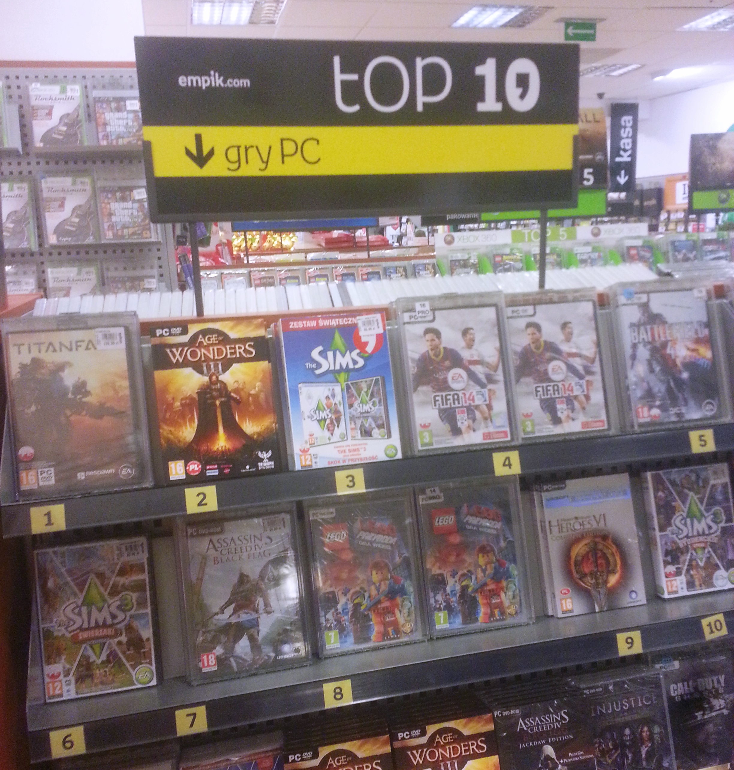 Salony Empik prowadzą ranking najczęściej kupowanych gier PC. Seria The Sims znalazła się w TOP 10 aż 3 razy. Na pierwszym miejscu jest oczywiście Titanfall, najnowsze wydawnictwo Electronic Arts. Zestaw Świąteczny, czyli gra podstawowa z dodatkiem The Sims 3: Skok W Przyszłość znalazła się na trzecim miejscu. Tuż za nią jest FIFA 14 oraz nowy Battlefield 4. Na szóstym miejscu mamy ponownie serię The Sims, tym razem The Sims 3: Zwierzaki. Po zabójcach, ludzikach LEGO i herosach mamy The Sims 3: Studenckie Życie. Moim zdaniem to bardzo dobry wynik. Pokazuje on, że seria The Sims 3 jeszcze się nigdzie nie wybiera i nie ustępuje miejsca Czwórce. Ranking zapewne się jeszcze zmieni, ponieważ trwa Simowe Szaleństwo Cenowe. 🙂