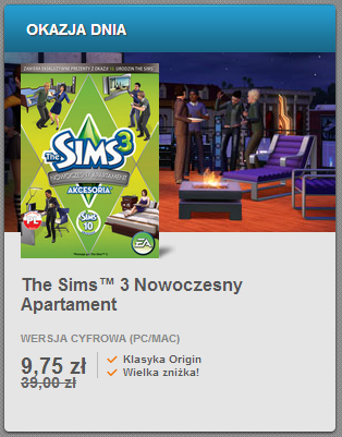 W sklepie Origin, akcesoria The Sims 3: Nowoczesny Apartament dostępne są za niecałe 10 złotych. Jeśli ktoś z Was nie ma jeszcze tego pakietu, to idealna okazja na uzupełnienie swojej kolekcji o ten tytuł. Jest to wersja akcesoriów z okazji X rocznicy serii The Sims, więc zawierają one dodatkowo przedmioty znane z poprzednich serii tj.: wibrujące łóżko w kształcie serca, gitarę elektryczną oraz akwarium. Ofertę znajdziecie tutaj. Miłych zakupów!