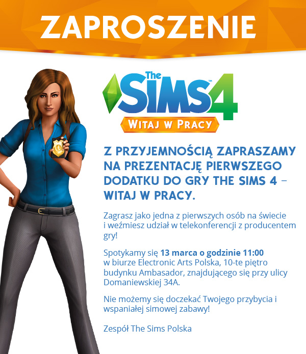 Pisałem już o tym wcześniej w jednej z nowinek, aczkolwiek informacja ta mogła zginąć wśród innych. Pragnę zatem poinformować, iż otrzymałem zaproszenie na zamknięty pokaz dodatku The Sims 4: Witaj w Pracy, który odbędzie się już w ten piątek w Warszawie. Zaproszeni goście będą mieli okazję pogrywać Simami, wraz z najnowszym dodatkiem, który pojawi się w kwietniu. Jest to świetna okazja, aby zbadać grę i poznać jej nowe możliwości. Przewidziana jest także rozmowa z producentem, więc możliwe będzie przeprowadzenie krótkiego wywiadu. Dziękuję Electronic Arts Polska za to zaproszenie. 🙂
