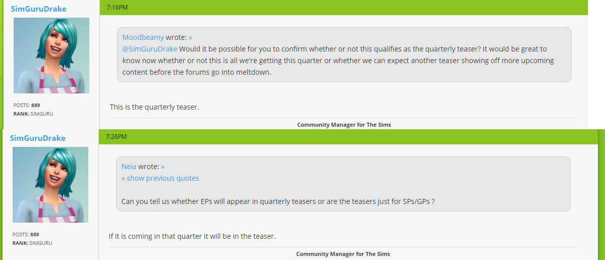 SimGuruDrake potwierdziła, iż jest to zapowiedź nowości na najbliższy kwartał – czyli około 3 miesiące. Zawartość inna niż podwórkowy zestaw, pojawi się najwcześniej we wrześniu. Oznacza to, że nowy dodatek pojawi się prawie rok po premierze The Sims 4 Spotkajmy się.