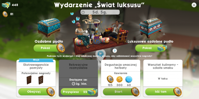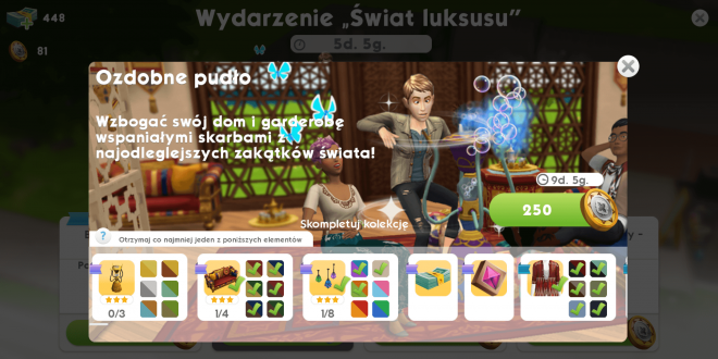 Głównym celem wydarzenia ,,Świat luksusu?? jest zbieranie specjalnej waluty związanej z wydarzeniem – monet luksusu. Pozwala ona na zakup ozdobnych pudeł z których wydobędziemy ubrania, meble oraz Simoleony, SimCash, Perełki Mody i Babeczki. Za wydarzenia otrzymujemy kolejno 400, 125 i 125 monet luksusu.