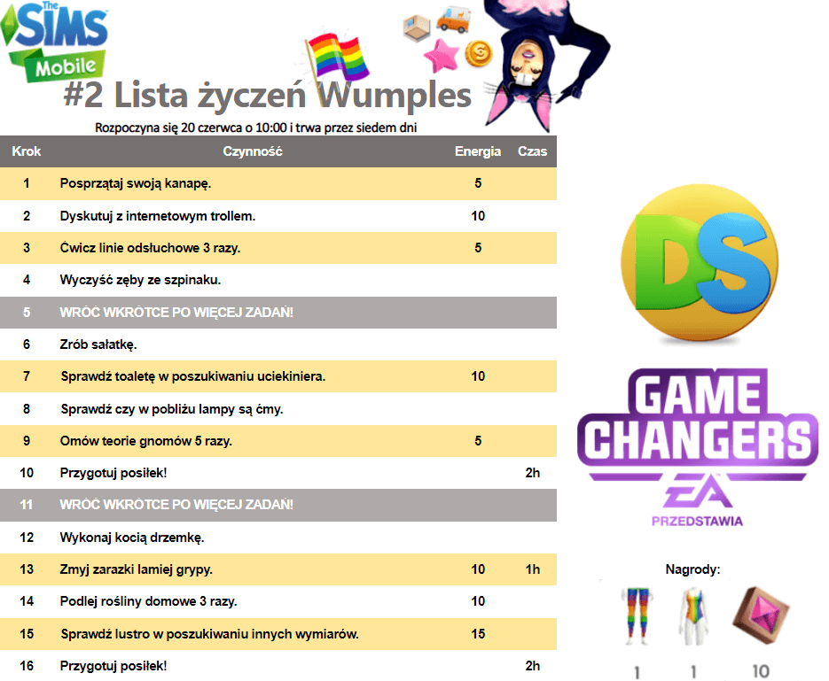Najnowsza aktualizacja The Sims Mobile wprowadza nas w klimat panującego Pride Month (pol. Miesiąca Dumy). Do 27 czerwca mamy możliwość odebrać darmowy prezent w postaci paczki z obiektami do CAS i trybu budowania. Jest to wynik współpracy The Sims z projektem It Gets Better. Niedługo dostępna będzie również nowa lista życzeń Wumples.