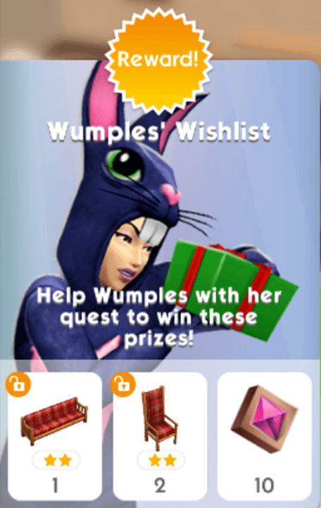 Wumples jest najbardziej zawadiacką Simką na świecie. Niedawno przybyła do nas z innej gry studia Firemonkeys ? The Sims FreePlay. Od tego czasu prosi o wypełnienie jej całej listy życzeń. Wykonanie wszystkich zadań jest nagradzane unikatowymi przedmiotami i pakietem perełek mody. Posiadanie obiektów pochodzących z listy życzeń Wumples, pozwala na zakup ich dodatkowych egzemplarzy.