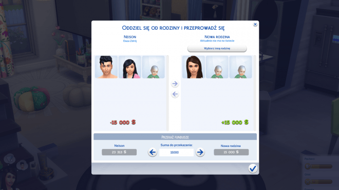 W telefonie dostępna jest nowa opcja – Oddziel się od rodziny i przeprowadź się. Po jej wybraniu pojawi się okno, w którym należy rozdzielić aktualnie graną rodzinę, a następnie zdecydować jaka kwota z funduszy rodziny trafi do Simów.