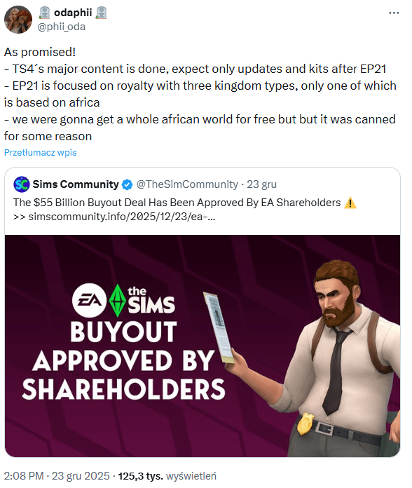 Rok 2025 był intensywny (otrzymaliśmy m.in. dodatki The Sims 4 Dochodowe Hobby, The Sims 4 Czar natury i The Sims 4 Przygoda wzywa), ale wizja, że w 2026 roku otrzymamy „tylko” jeden dodatek (EP21) i pożegnamy się z dużymi nowościami w Czwórce na rzecz Project X, jest dla wielu graczy szokująca. Czy bylibyście gotowi zamienić obecną grę na nową generację, czy wolicie, aby The Sims 4 trwało wiecznie?